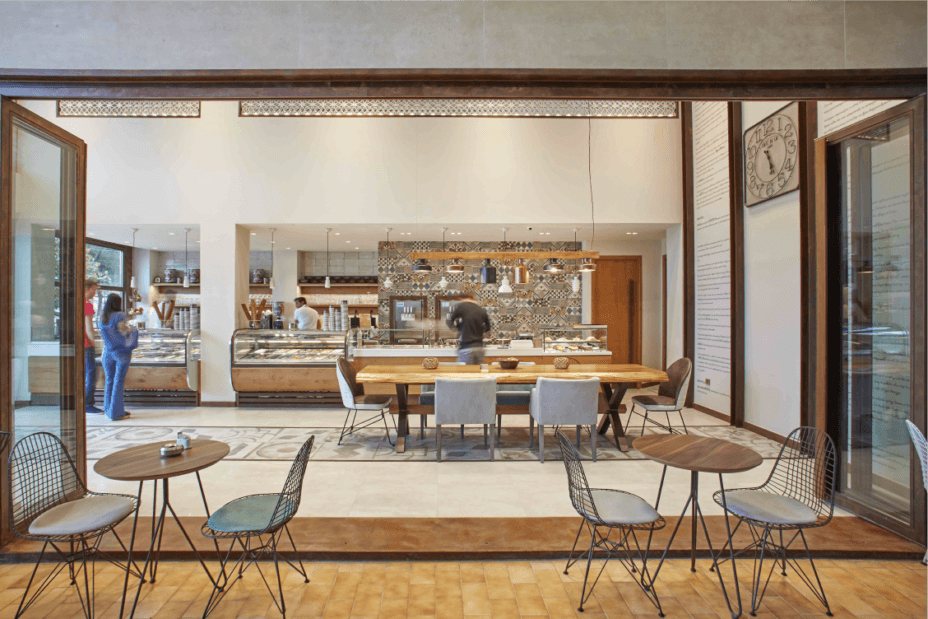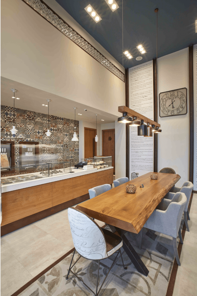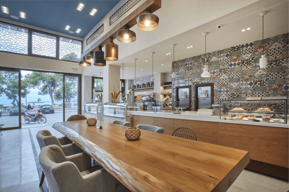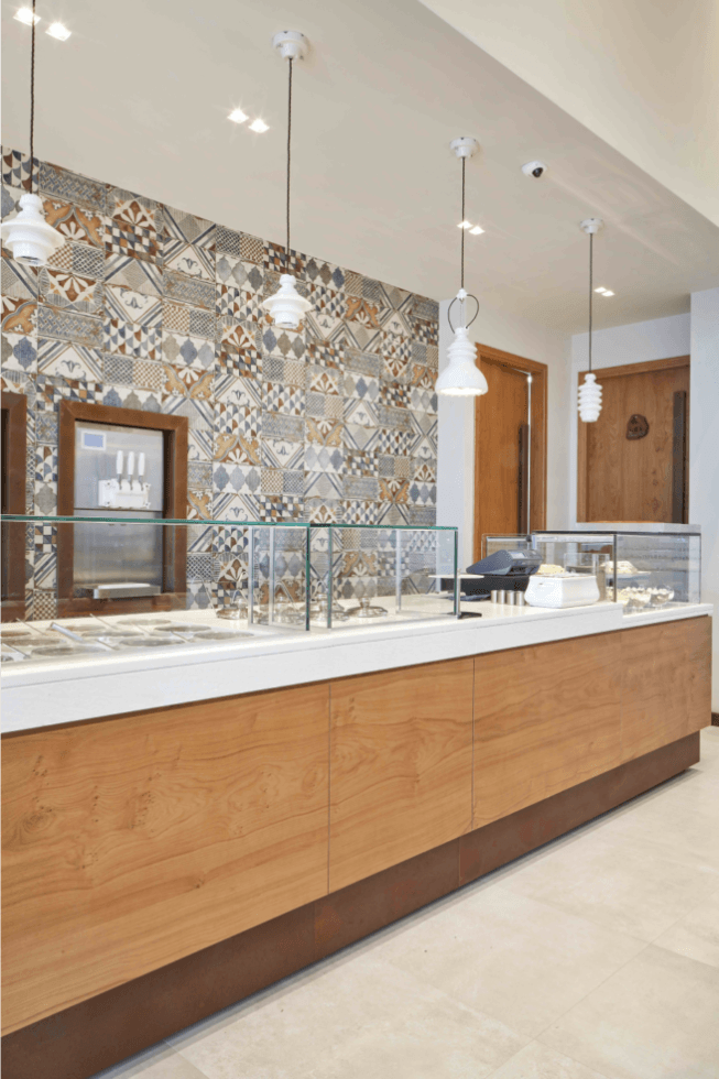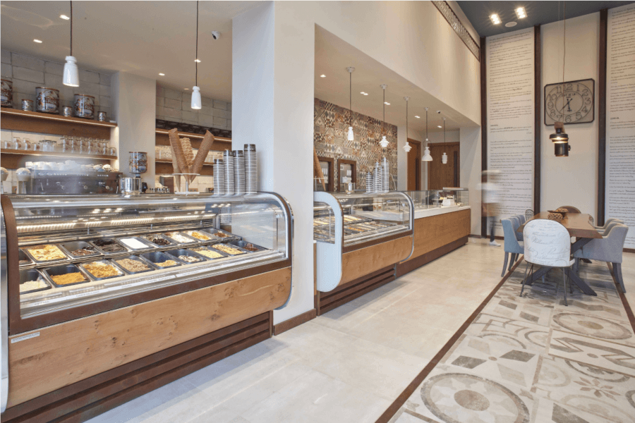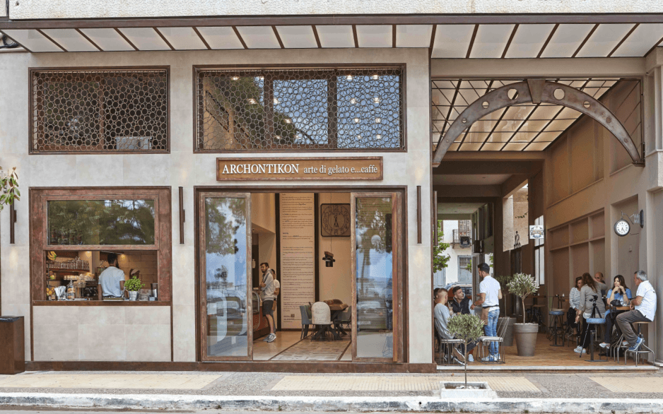 The initiative by Mr. Roumeliotis to construct a new ARCHONTIKON arte di gelato e café store in Itea was put into effect by D. Antonopoulos SA. The flavours of ice cream are displayed through 2 large and luxurious vitrines while the chocolate fountain attracts people of all ages. Soft ice cream and frozen yogurt machines promise a delightful experience perfectly complemented with a coffee table with a view of the main road. Fine architectural elements of the store, like the modern lamps, the white marble countertop, the specially selected tiles, make up an atmosphere of discreet luxury.