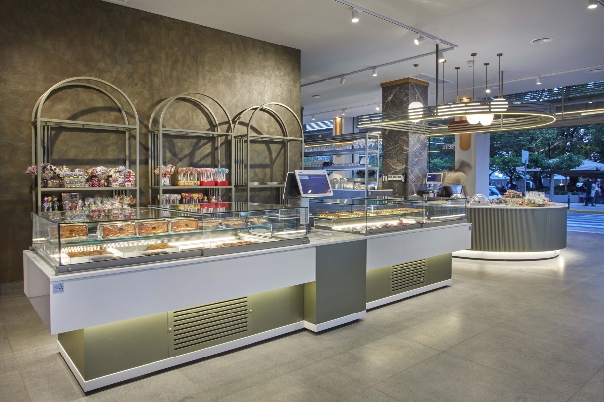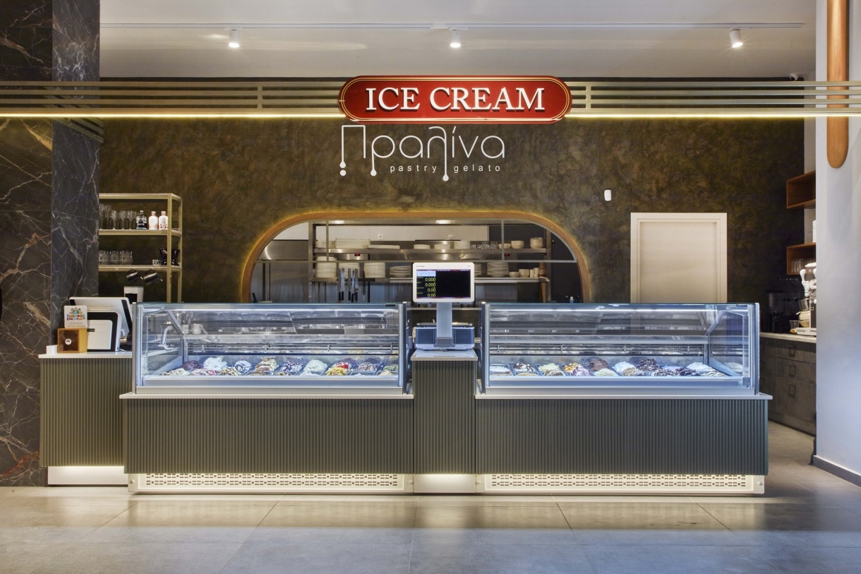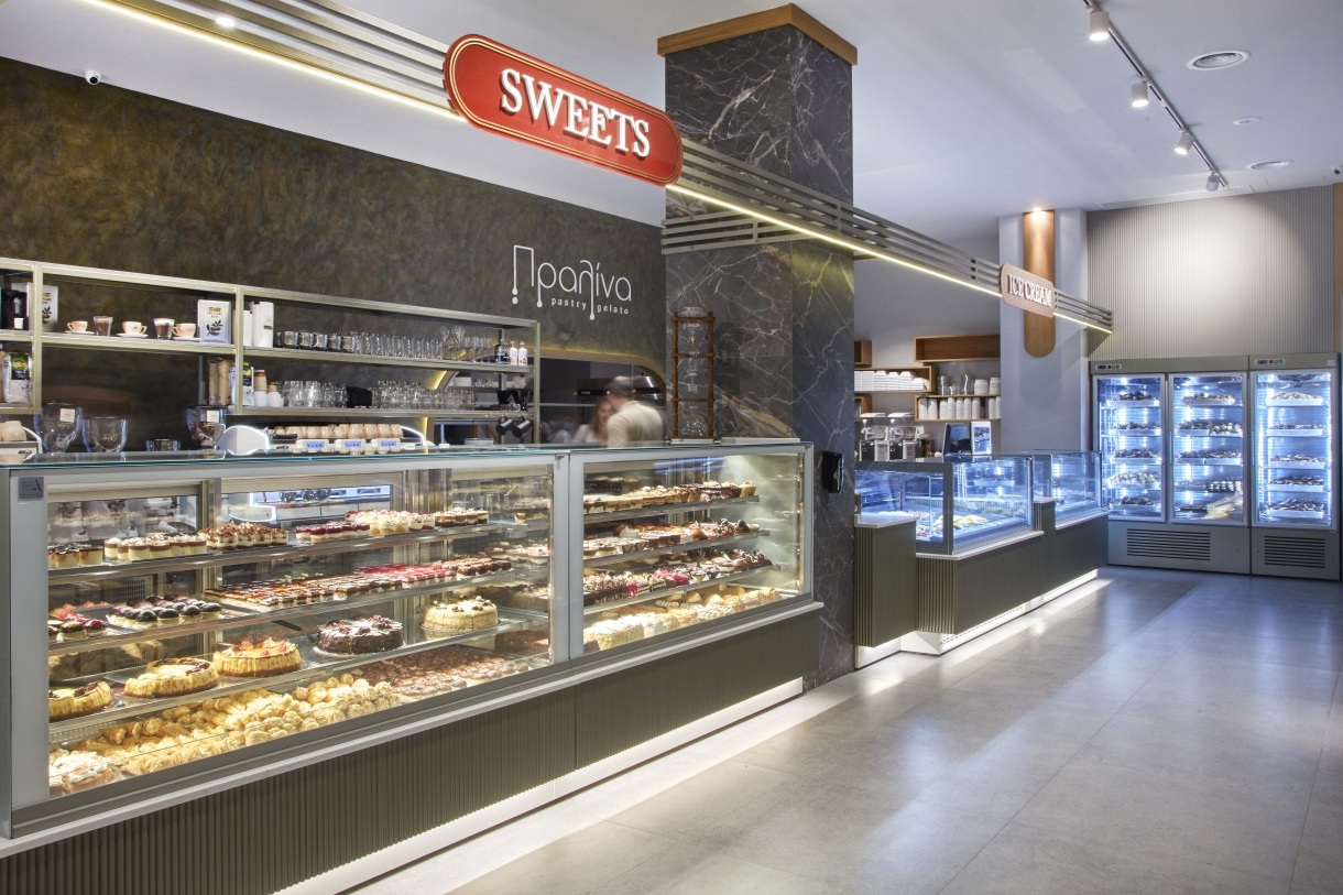 A new landmark has recently been added to the city of Kalamata — the Pralina store, located along the vibrant coastal road.Once again, the owner placed their trust in D. Antonopoulos ABEE, assigning the company with the complete study, design, and construction of the equipment infrastructure.The main challenge of the project was to combine all-day functionality, distinct architectural characteristics, and a refined, luxurious aesthetic. To meet these demands, custom equipment solutions were developed and installed. Advanced 18-position freezers were chosen for ice cream, high-performance four-level glass display cases were installed for pastries, and large panoramic showcases were used for traditional syrup-based sweets.All products are presented directly in front of the customer, offering an inviting selection to accompany their favorite beverage.From its very first day of operation, the new Pralina store has stood out for its elegant atmosphere and outstanding visual identity.